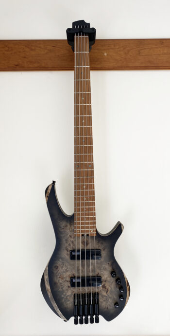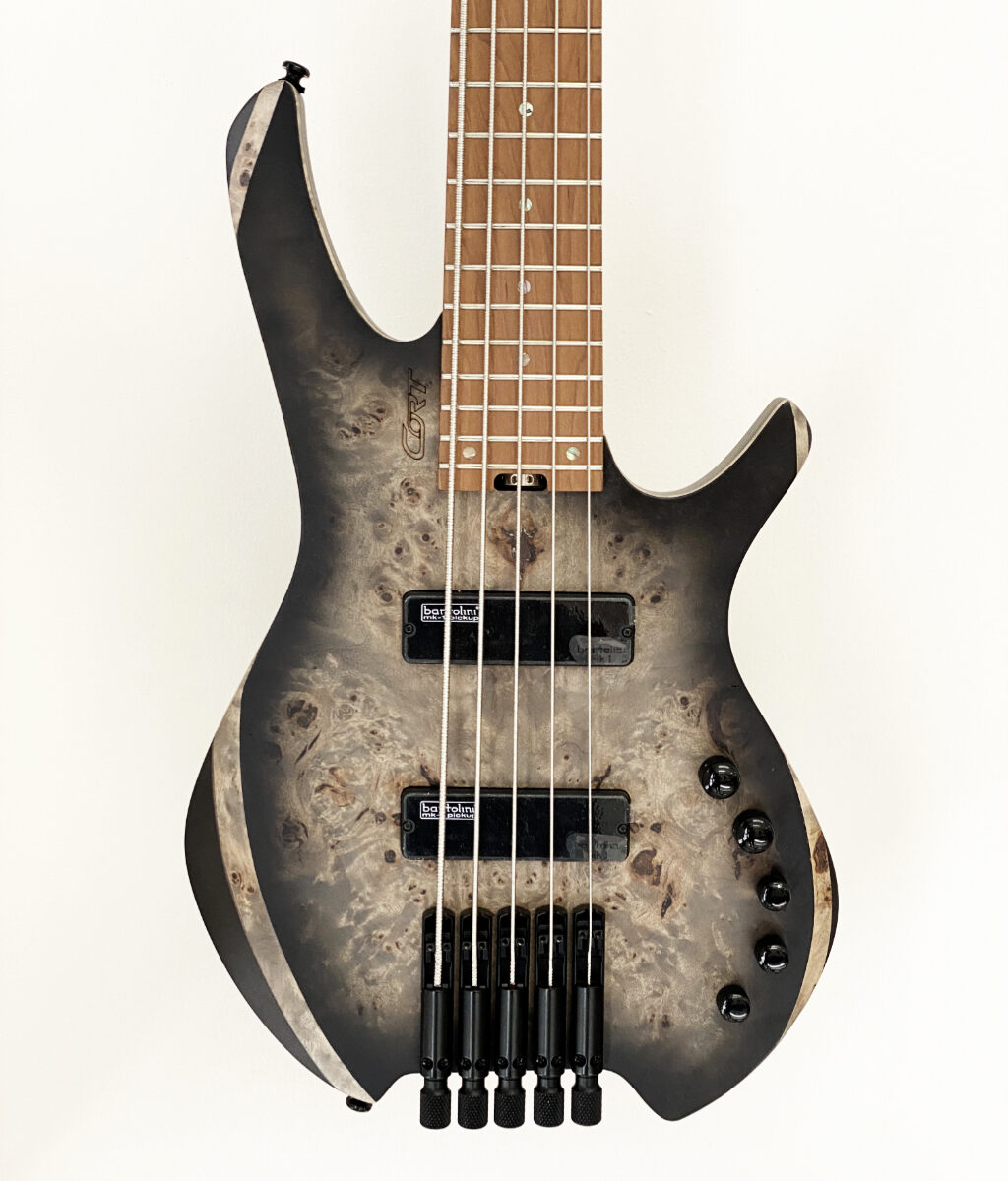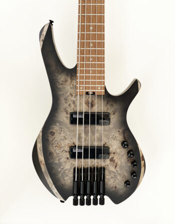 Space 5 headless bass features a Poplar Burl top on the soft Maple body to ensure a great balance between tight full sounding lows with bright and transparent highs. In addition to that, the beautiful wood grain of the Poplar Burl top provides a natural organic aesthetic.