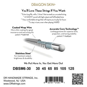 Dragon Skin+ Multi-Scale Coated Stainless Steel 6-string bass strings sound huge, are easy to play, and have outstanding endurance. Dragon Skin+ bass strings upgrades both the core and the wrap wires to be exceptionally musical, balanced, and loud. Accurate Core Technology™ creates grooves on the core to cradle the wrap wire, allowing the strings to ring out to their full potential.