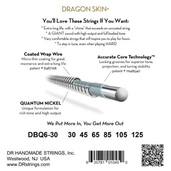 Dragon Skin+ Coated Quantum Nickel 6-string bass strings sound huge, are easy to play, and have outstanding endurance. Dragon Skin+ bass strings upgrades both the core and the wrap wires to be exceptionally musical, balanced, and loud. Accurate Core Technology™ creates grooves on the core to cradle the wrap wire, allowing the strings to ring out to their full potential.