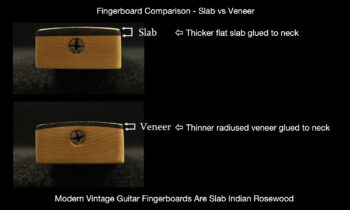 The MVS-64 guitar has an authentic Indian Rosewood ‘Slab’ fingerboard. This is a genuine Dalbergia (Rosewood) not Pau Ferro, Morado, Bolivian or other substitute. The ‘slab’ fingerboard is highly desired by vintage collectors as the wood content is more stable and resonant than the ‘mid-60s veneer board construction.