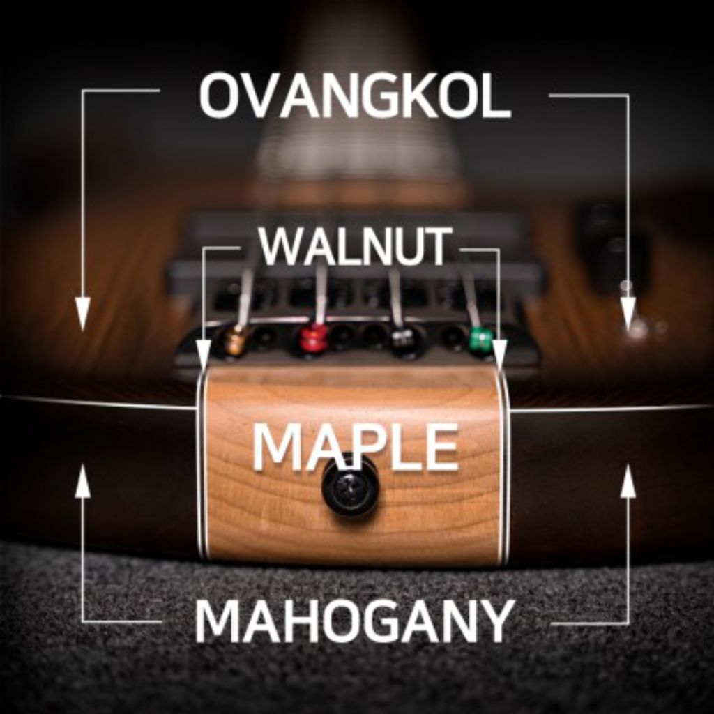 The luxurious aesthetics of Ovangkol consisting of cinnamon-brown with darker streaks of color is hard to resist. Known as a great overall tone wood, Ovangkol shares similar tone characteristics as Rosewood and Bubinga with a slightly fuller midrange and a top end that’s not quite bright sounding, but the strategically placed Maple in the centre makes up for the missing highs. The combination of Ovangkol top and Maple core, together with warmer sounding Mahogany wings provides a perfect mixture of balanced tone.